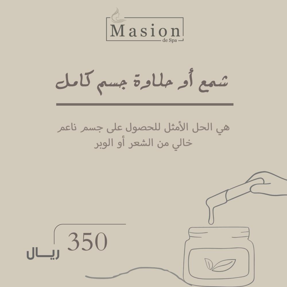 استمتعي ببشرة ناعمة وخالية من الشعر مع خدمة "شمع أو حلاوة للجسم كامل" من ماسيون سبا. نقدم لك تجربة فاخرة لإزالة الشعر من جميع أنحاء جسمك باستخدام أفضل المواد الطبيعية التي تمنحك راحة وجمالاً يدومان طويلاً.