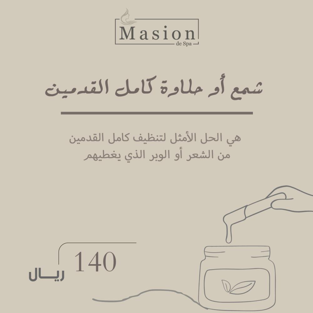 دللي قدميك مع جلسة العناية المميزة "شمع أو حلاوة كامل القدمين" من ماسيون سبا. خدمة فاخرة تهتم بجمال قدميك و تمنحك إحساسًا بالراحة والانتعاش، مما يجعل قدميك ناعمتين و خاليتين من الشعر.